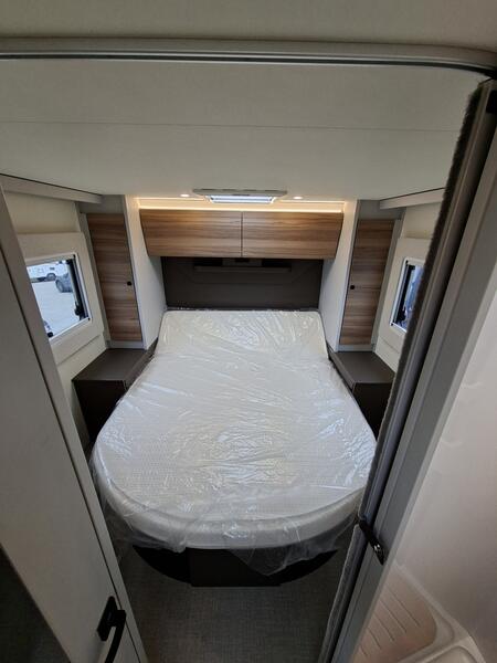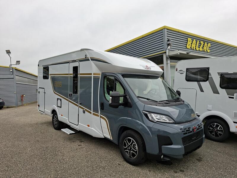 SERIE B 66Motorisation Fiat 2,2l 140ch avec boîte automatique Jantes aluminium 16‘‘ Feux antibrouillard avant, frein à main électrique Volant multifonctions et pommeau gainés de cuir Couleur cabine Gris Lanzarote et graphisme exclusif „B66“ Station multimédia avec caméra de recul Batterie lithium 105 Ah Porte d‘entrée avec baie, moustiquaire & verrouillage centralisé Stores plissés cabine Baies à encadrement, porte garage côté gauche Sellerie exclusive en cuir avec matelassage et surpiqûres B66 Pack éclairage indirect Lit central réglable en hauteur Double-plancher technique isolé et chauffé : 0 €