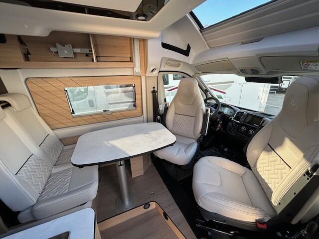 PACK SAPHIR Jantes 16'' en alliage léger bi-ton, volant confort, habillage gris sur aérateurs, Feux avant 100% LED, allumage automatique des feux et des essuie glace, Frein de stationnement électrique, pare choc avant couleur carrosserie + skid plate noire + feux anti brouillard, Peinture carrosserie métallisée Gris Artense, Toit panoramique Skyview, Renfort pneumatique suspension essieu arrière sans compresseur, Couchage dinette 1 place, Panneau solaire 150W (monté),TRUMA Combi 4 DIESEL avec kit altitude et commande de chauffage CP PLUS (oblige 2e batterie cellule) : 9590 €