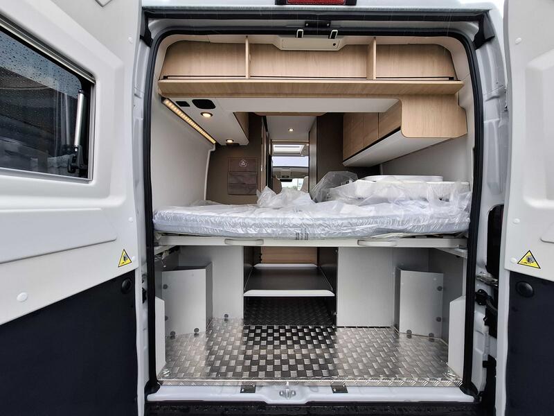 Dimensions couchages arrière : Lit transversal sur soute : 132 x 195 cm