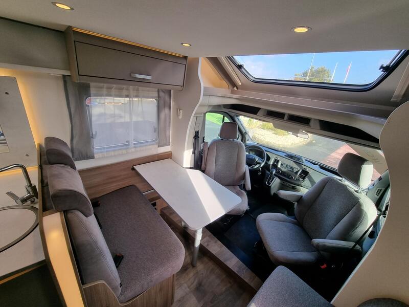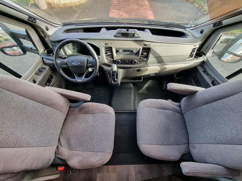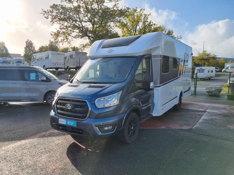 Sur-équipement Série Edition 24Ford Transit 2,0 l TDCi - EURO 6, Couleur cabine extérieure : bleu Chroma, Pare-chocs avant peint, Jantes alliage 16", Stores plissés de cabine, Toit panoramique de cabine (pour série T), Grand réfrigérateur 156 l avec freezer séparé 29 l, Réservoir eaux usées isolé, Store extérieur (longueur selon implantation), Baies à cadre affleurant, Montants design arrière, 2ème trappe extérieure (selon modèle), Sérigraphie série spéciale, Ambiance grise, Pack Confort, Pack Châssis : 0 €