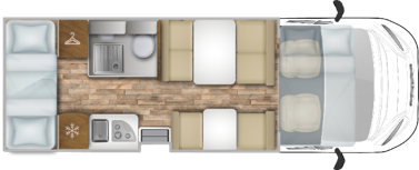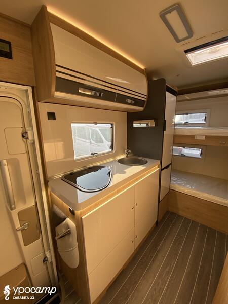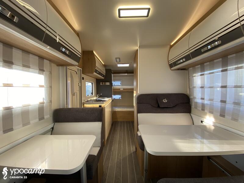 Dimensions couchages arrière : Lit superposé : 215x80 - 215x80 / Lit Dinette : 186x125 - 160x65