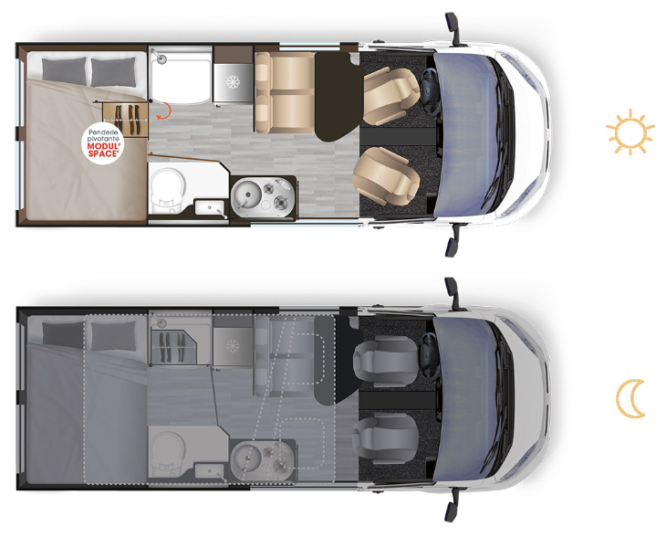 Options usineFinition Fun + = Éléments de la finition FUN / Peinture pare-choc avant couleur carrosserie / Skid plate bouclier avant noire / Commandes radio au volant / Feux antibrouillard avant / Découpe cabine / Station multimédia DAB PIONEER® avec écran 6,8" et fonctions APPLE CAR PLAY / ANDROID AUTO / Caméra de recul avec écran de contrôle intégré au tableau de bord / Ambiance TISSU / TEP* PEPPER ou TEP* ARIZONA / Salle d'eau Module Space / 2e Batterie cellule AGM 92Ah / 2e clé télécommande (PLIP) / Gouttière porte latérale avec éclairage LED intégré / Décoration extérieure FUN+ / PACK START : - Porte moustiquaire ouvrant latéral - Stores pare-brise et baies cabine isothermes double plissés à cassette - Marchepied électrique + Boite automatique : 9820 €