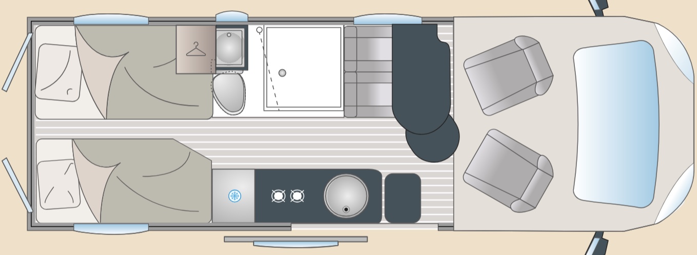 Type de couchages : Lit dinette + Lits jumeaux sur soute