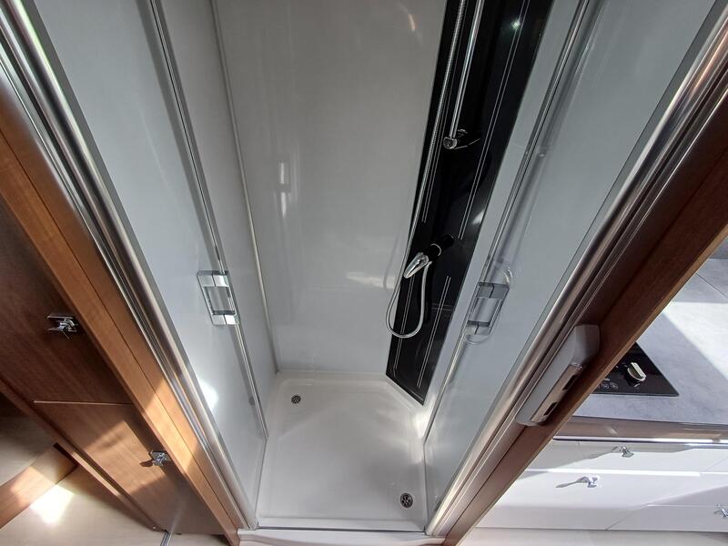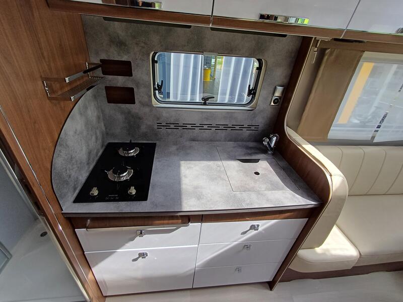 Pack CelluleEntrée avec TV 32 pouces, revêtement simili cuir anthracite, cuisine compacte et banquette face-face, résine synthèse Miracle White, prise gaz extérieur, douchette extérieure, lanterneau avec ventilateur, décor intérieur personnalisé : 11001 €