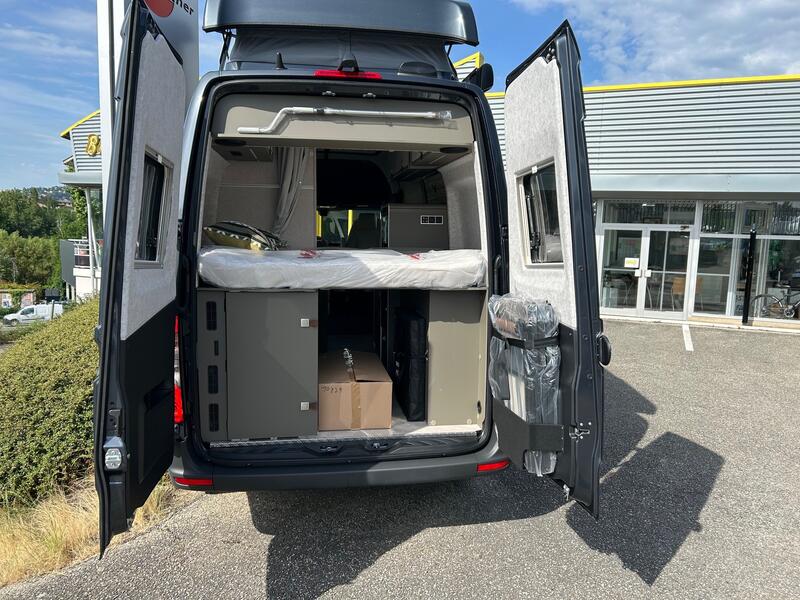 Toit relevable coloris du véhicule (lit double maxi avec système grand confort) + Baie projetante arrière côté gauche avec store occultant et moustiquaire + ISOFIX + Chaises pliantes (2 pièces) + table (y compris fixation) + Résistance électrique de 1 800 W (pour chauffage à air chaud diesel de 6 kW) + Panneaux solaires 2 x 95 W avec régulateur MPPT et écran d'affichage (pour toit relevable) + Filtre pour le circuit d'eau propre + Marchepied électrique tout-terrain (escamotable) pour une meilleure garde au sol : 9500 €