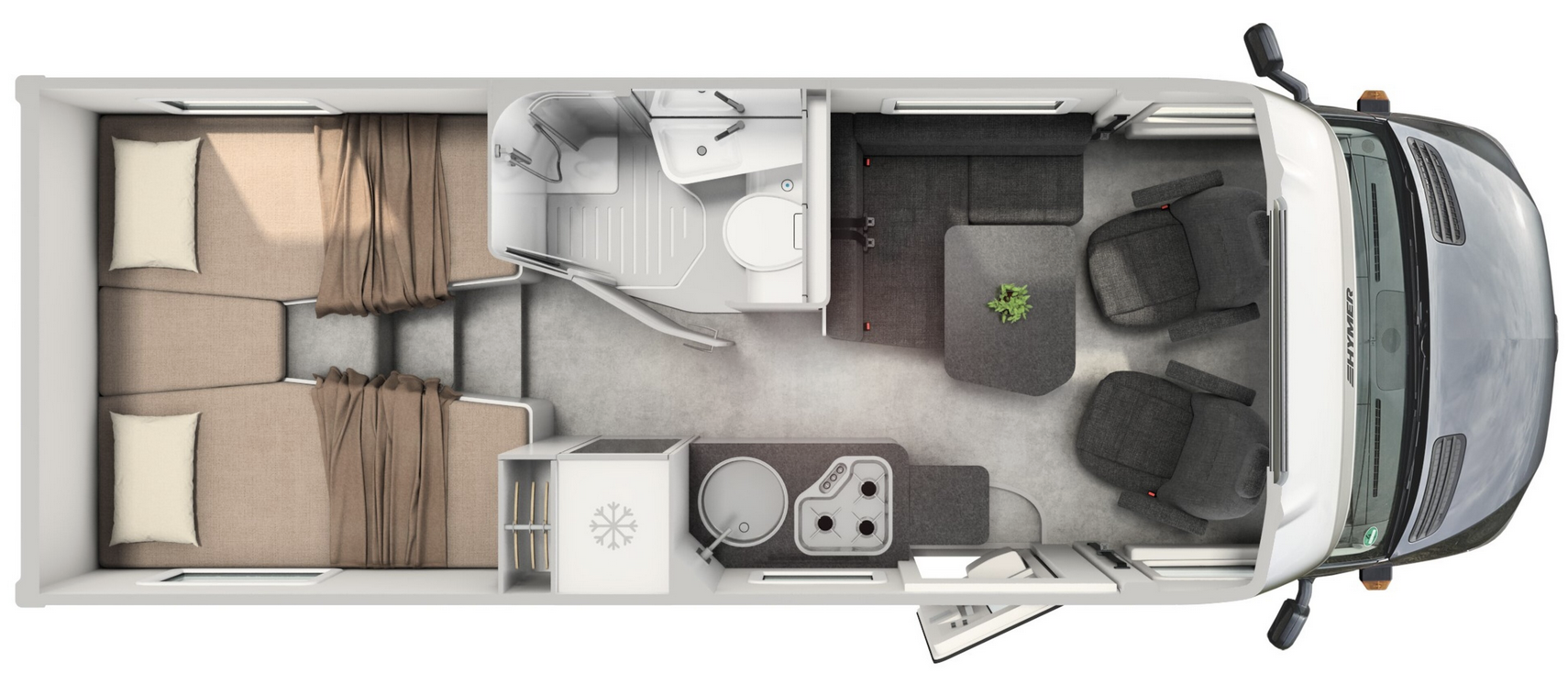 Options usine Cellule intérieureMatelas supplémentaire entre lits jumeaux (455€) / Salon en L (500€) / Chauffage Truma Combi 6 DE (585€) / Filtre à eau potable (250€) / Transformation salon en couchage (400€) : 2190 €