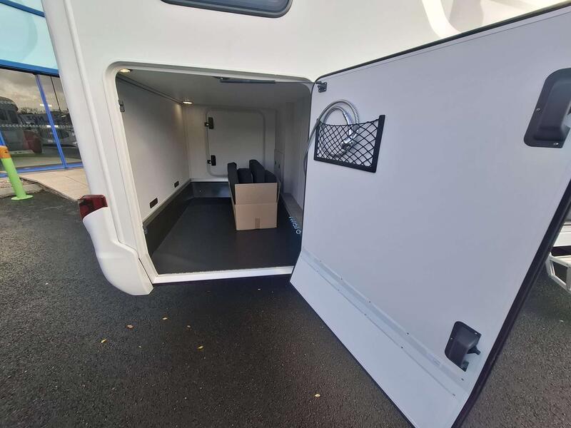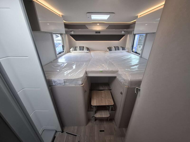 PACK STYLE Bandes décoratives chromées sur la calandre Spoiler, éléments face avant et cadre de la calandre peints couleur carrosserie Feux antibrouillard avec feux de virage + Mercedes-Benz Sprinter 4,2 t - 417 CDI - 125 KW/170 ch - Euro VI-E + Diminution de PTAC à 3,5 t (pour Mercedes-Benz Sprinter 415/417 CDI) + Couleur extérieure cabine : noir Obsidienne (métallisé) + Jantes alliage 16" (coloris noir) avec pneus quatre saisons + Porte cellule confort avec baie, store occultant, poubelle intégrée et double verrouillage + Douche extérieure dans le garage + Lit de pavillon électrique au-dessus de la dînette avec matelas à mousse froide + Coussin supplémentaire pour lits jumeaux avec accès confort + Chauffage à air pulsé au diesel 6 kW avec chauffe-eau 10 l, kit altitude et résistance électrique 1800 W + Support écran plat 22" : 12125 €