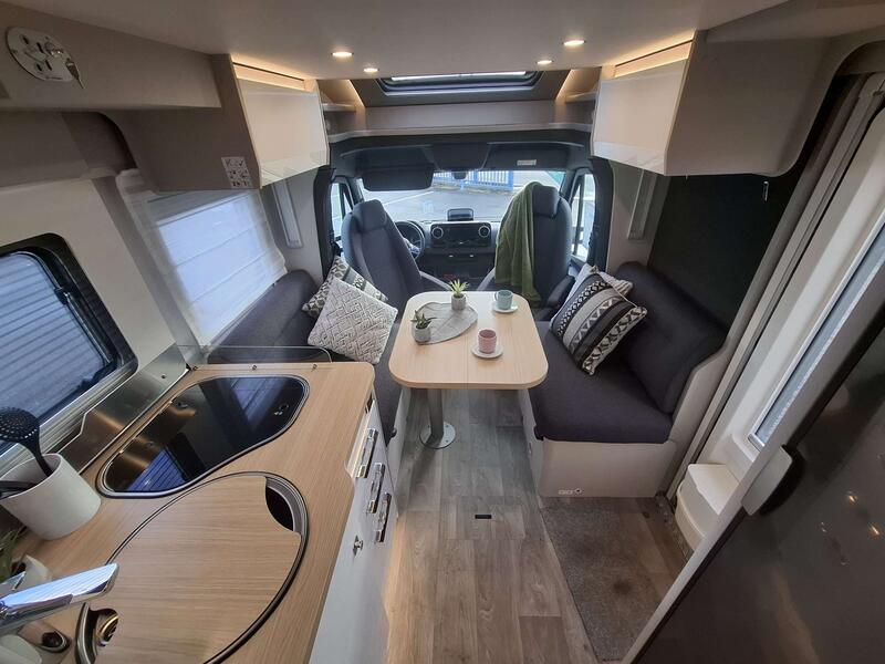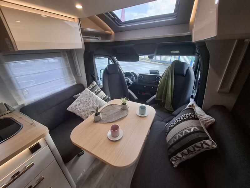 OPTIONS CONSTRUCTEURFINITION PLUS Boîte de vitesses automatique 9G-TRONIC incluant la fonction Hold Essieu avant renforcé Bande filtrante thermo-isolante sur pare-brise Pack Acoustique Mercedes-Benz Frein de stationnement électrique Climatisation semi-automatique TEMPMATIC Instrumentation combinée avec écran Pixel-Matrix Mercedes-Benz Volant cuir (uniquement avec la boîte de vitesses automatique) Volant multifonction Régulateur de vitesse avec commandes au volant Régulateur de vitesse actif DISTRONIC PLUS avec commandes au volant Détecteur de franchissement de ligne Assistant vigilance du conducteur Détecteur de pluie Assistant reconnaissance des panneaux de signalisation Radio DAB Système multimédia MBUX avec navigation, intégration pour smartphone, commande vocale et caméra de recul Système multimédia MBUX 10,25" avec caméra de recul, commande vocale et écran tactile + PACK CONFORT CELLULE TRAMP S Prises supplémentaires : 4 x 230 V / 1 x 12 V / 1 x double-USB Coussins avec housses (4 pièces) Éclairage d'ambiance Draps-housses sur mesure pour lits arrière adaptés aux contours du matelas Trappe extérieure côté gauche, 75 x 85 cm : 7555 €