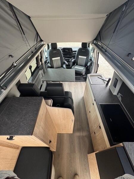 Pack Custom2 ème porte latérale vitrée côté gauche, prédisposition panneau solaire, banquette BZ électrique, Chauffe-eau Truma avec boiler 10 l, batterie cellule 92 Ah, table camping avec 4 pieds ajustables + Sacoche de 2 fauteuils de camping , préparation faisceau électrique attelage, variateur de luminosité, tapis de sol cabine, rideaux opacifiants : 890 €