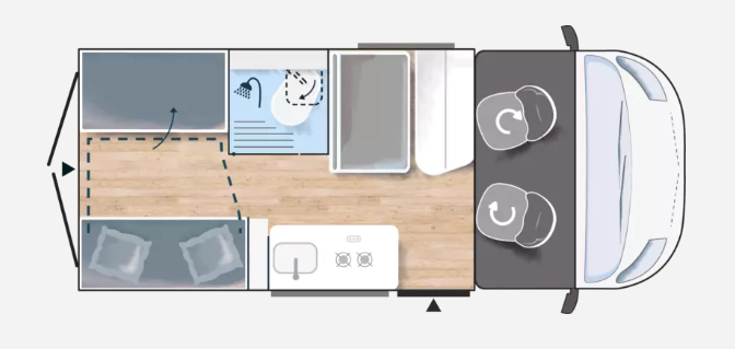 C'est le plan légendaire que les amateurs plébiscitent : Compact (5,99m), le V114 se faufile partout, en ville comme à la campagne ! Salon convivial, salle de bains & cuisine fonctionnelles, le V114 vous séduira aussi par son lit arrière 2 places qui se relève pour dégager de l'espace et son toit relevable avec un lit 2 places.